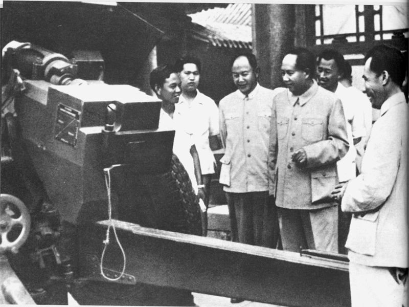 1958年6月6日毛泽东主席在国防工业汇报展览会兵器馆仔细观看54式122毫米榴弹炮