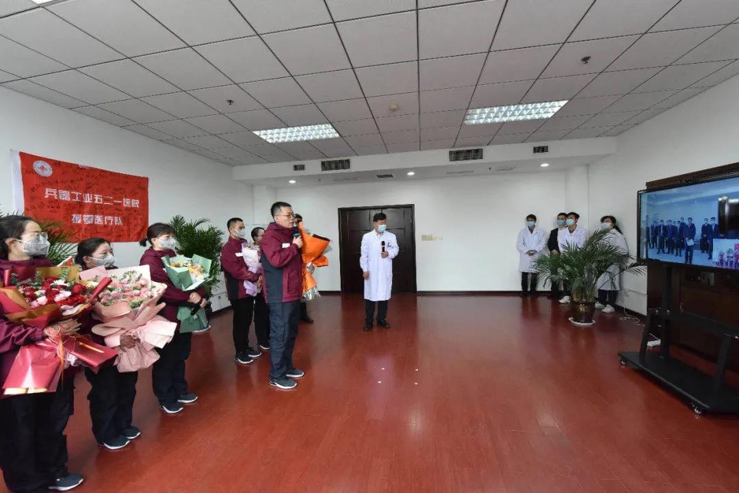 焦开河指出,面对突如其来的新冠肺炎疫情的严峻考验,521医院7名援鄂医疗队队员坚决响应习近平总书记和党中央号召,肩负集团公司党组和全集团23万干部职工的重托,闻令而动、挺身而出,奔赴抗击疫情第一线。援鄂期间,杭博、郭苓、缑豪兵、杨娇4位同志,充分发挥了共产党员的先锋模范作用,吕戈、侯永生、曹利娜3位同志火线入党,不辱使命、不负重托,出色完成了任务。7位同志的辛勤付出,充分体现了“把一切献给党”的人民兵工精神,体现了大爱无疆的医者仁心,体现了集团公司大国顶梁柱的责任担当,为党旗争了光,为集团公司添了彩。全集团广大干部职工要学习他们的先进事迹,为夺取疫情防控和实现全年目标任务的“双胜利”不懈奋斗!