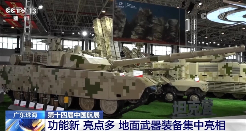 兵器工业集团专家 程子恒:在最中心位展示的是我们VT4系列的重型主战坦克,在旁边我们还看到有一款轮式的无人车。我们的坦克是一个履带式的,在一些特殊泥泞的环境,我们是靠履带行进的,但是我们会发现有一些需要高速行进的场景,轮式有很强的机动性,那么用轮式的无人车高速到前端进行侦查的任务,做一个轮履的相互配合,相互互补。