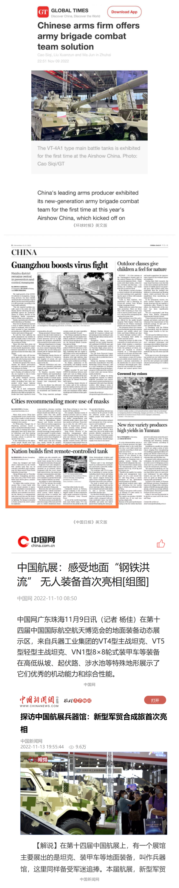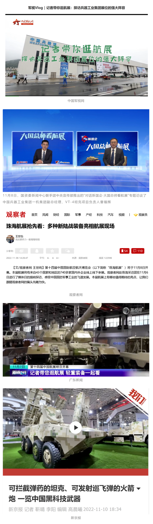 央视国防军事频道航展特别报道《炫舞天地间》11月12日《赏“铁甲雄风”!看航展地面装备“钢铁洪流”名场面》对兵器工业集团武器装备特色亮点进行报道。《国防军事早报》11月7日推出报道《第十四届中国国际航空航天博览会明天开幕 中国兵器馆首次以陆军合成旅实战体系形式展出》,对兵器馆陆军合成旅实战体系进行报道。《军事报道》11月9日推出《第十四届中国国际航空航天博览会 地面兵器装备首次联合陆航直升机进行动态展示》报道。《军迷行天下》11月9日推出报道《军迷打卡航展2022》以专业军迷视角探馆兵器馆,全面展示兵器工业集团参展装备特色亮点。