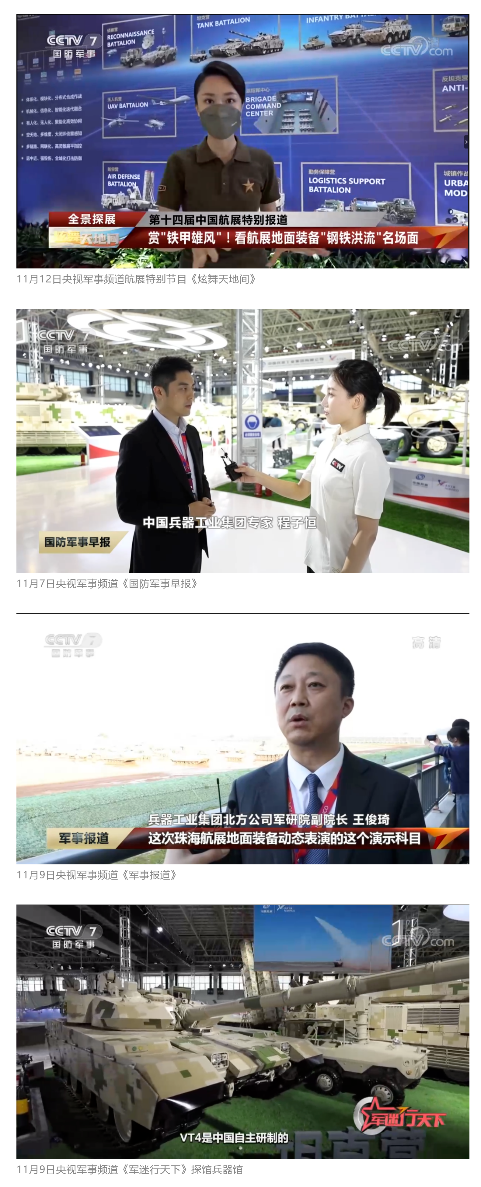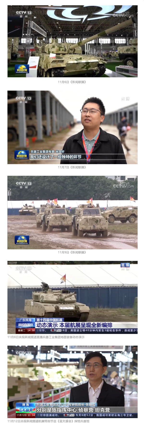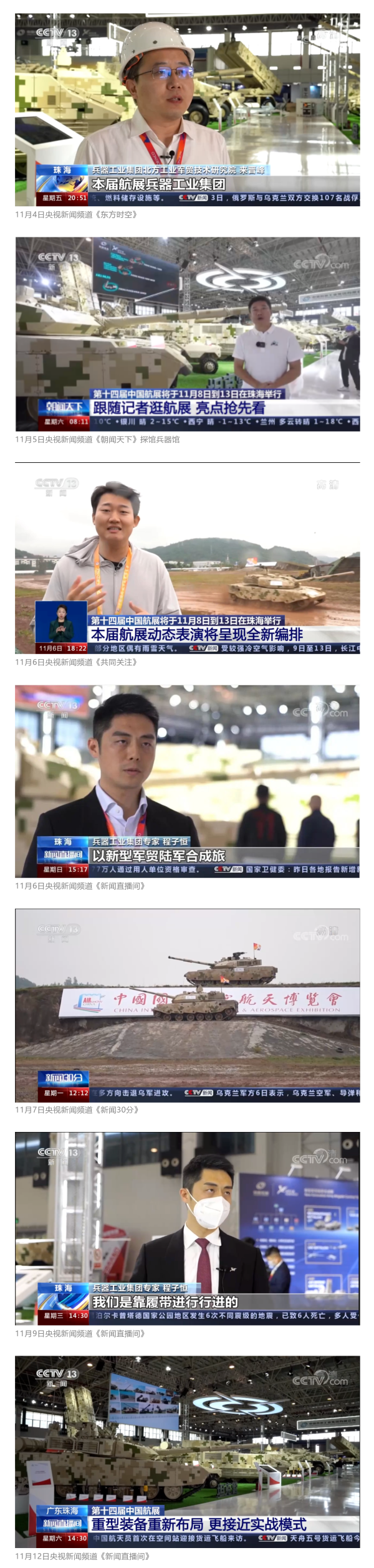 此次航展,央视新闻频道《朝闻天下》《新闻直播间》《东方时空》《共同关注》《新闻30分》《24小时》、央视国防军事频道《国防军事早报》《军事报道》《军迷行天下》、央视国际频道《中国新闻》《今日环球》等栏目共播出兵器工业集团参展相关新闻报道30余条。