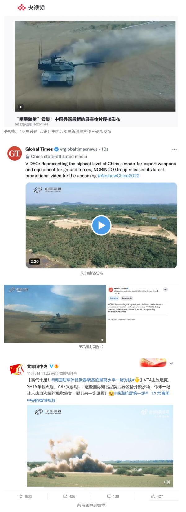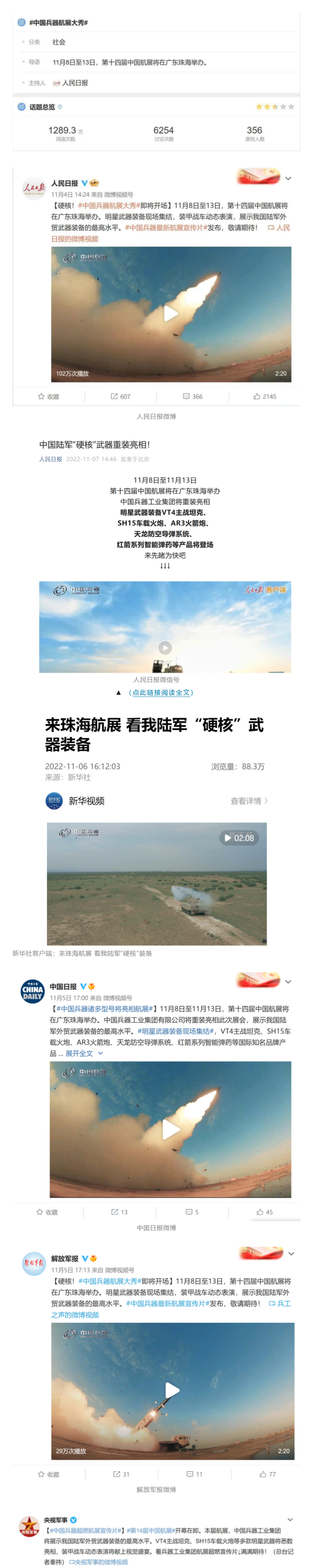 人民日报官方微博、微信公众号,新华社客户端、央视新闻客户端、中国日报微博、参考消息微信公众号、解放军报微博、央视军事微博、CGTN微博、中国军号微博、共青团中央微博、环球时报(英文网站、脸书账号、推特账号)、哔哩哔哩、学习强国平台、国资小新视频号、网易军事、腾讯军事、凤凰军事、北京日报、东方卫视看看新闻全媒体、北京电视台等20余家中央主流媒体、国家部委、省市媒体的新媒体第一时间播发集团公司航展宣传片等视频作品燃爆全网,累计阅读量突破1700万人次。集团公司微信公众号、微博、抖音号、快手号、微信视频号、知乎号等新媒体宣传片播放阅读量超过800万人次,点赞超过30万人次。集团公司微信公众号推出《硬核!中国兵器最新航展宣传片发布》《中国兵器航展节目单,请选出心中明星装备》《航展首日,中国兵器闪耀亮相!》等7篇报道,阅读量超过25万人次,集团公司微信视频号、抖音号、快手号等新媒体账号发布“中国兵器航展大秀”系列视频,观看量超过330万人次。