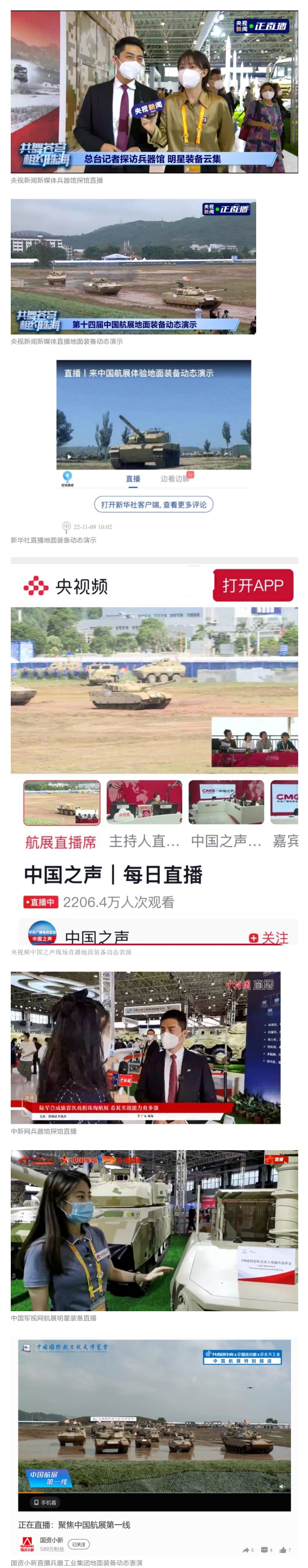 央视新闻新媒体、央视频中国之声、新华社、中国新闻网、中国军视网、CGTN(微博、脸书、推特)等媒体以及国资小新、共青团中央、凤凰军事等到兵器工业集团地面动态演示区、中国兵器馆进行了直播。航展期间,集团公司微信视频号、微博、抖音号、快手号共进行8次直播,最高观看人数突破24万。