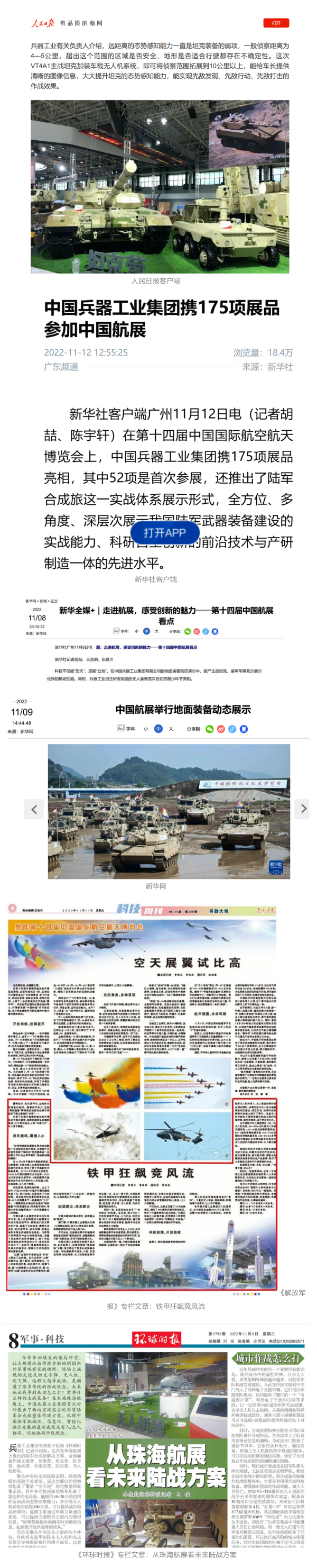 人民日报客户端、新华社客户端、新华网、央视新闻客户端、《解放军报》、《环球时报》、《中国日报》、中国网、人民网、中国新闻网、央视网、央广网、中国军视网、中国之声,图片中国、观察者网、凤凰网、新浪网、搜狐网、网易网、今日头条等中央主流媒体和知名网络媒体以及南方日报、广东卫视、广东新闻、北京时间、新京报、珠海电视台、看看新闻等省市媒体对集团公司参展情况进行了浓墨重彩的图片、文字、视频报道。