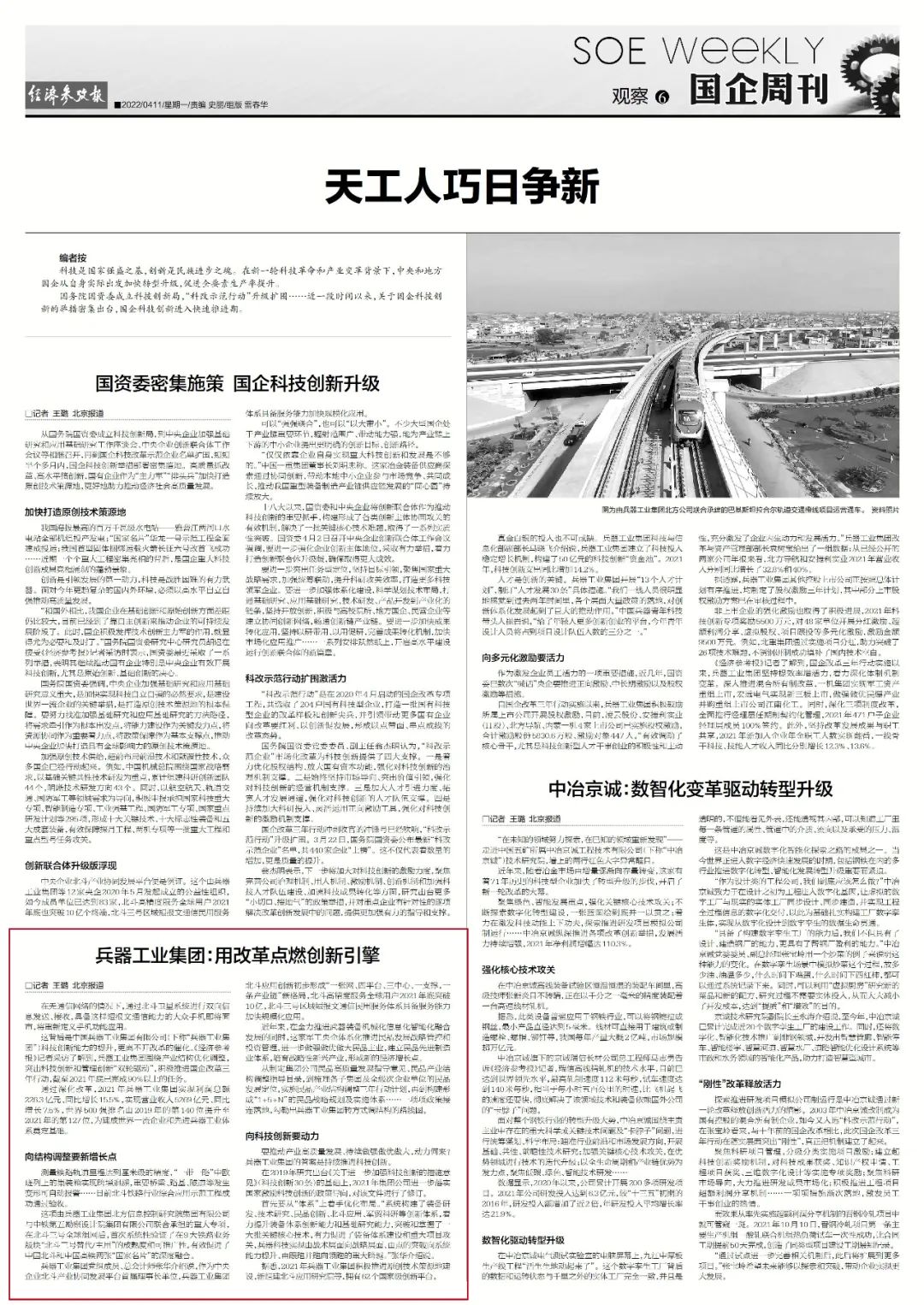 近日,环球(中国)体育官方网站国企改革三年行动的经验做法和工作成效引发媒体广泛关注。中国新闻社、中国网、工人日报客户端、光明日报客户端、新华财经、国资报告、人民网、国资委网站、人民政协网、《证券日报》、学习强国平台、央广经济之声、第一财经客户端、新华社、《经济参考报》、海外网、中工网、腾讯网、新浪网、搜狐网、网易网等中央主流媒体、国家部委网站及知名网络媒体对集团公司国企改革三年行动情况进行了刊载报道。 中国新闻社:兵器工业集团:国企改革三年行动156项改革举措2021年底已完成90%以上 中国网:兵器工业集团“四个坚持”促改革 成效显著 中国网:兵器工业集团体系化推进民品发展战略 布局17个重点产业领域 工人日报客户端:兵器工业集团国企改革三年行动取得显著成效 光明日报客户端:兵器工业集团国企改革三年行动成效显著 新华财经:兵器工业集团三年行动见实效 国资报告:聚焦高水平自立自强,兵器工业集团深化体制机制变革成效显著 人民网:“国企改革三年行动”系列报道——三项制度改革进一步走深走实 国有企业活力动力明显增强 国资委网站:【对标世界一流 央企加速奔跑】兵器工业集团国企改革三年行动成效显著 人民政协网:兵器工业集团改革举措走深走实 创新激发企业活力 《证券日报》:一季度17家央企控股上市公司实施股权激励 业绩印证激励实效 学习强国平台:兵器工业集团国企改革三年行动成效显著 第一财经客户端:国企改革三年行动攻坚冲刺,中长期激励有望深层次突破 新华社、《经济参考报》:国企改革三年行动迎考 混改上市动作频频 中长期激励扩围升级 《证券日报》:年内8家国有控股公司登陆A股 39家排队中 《经济参考报》:兵器工业集团:用改革点燃创新引擎 |