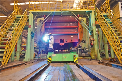中国兵器工业集团一机集团北方创业公司生产线开足马力生产铁路车辆产品。日前,为圆满完成1200台C70E(H)型通用敞车生产任务,该公司不断创新生产组织模式,新、旧两条生产线全面启动,白、夜班双班组织生产,有效保障生产进度。(王磊 摄)