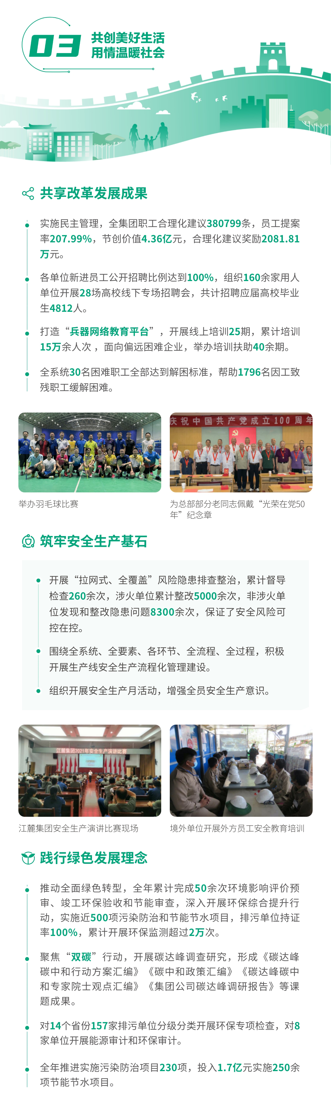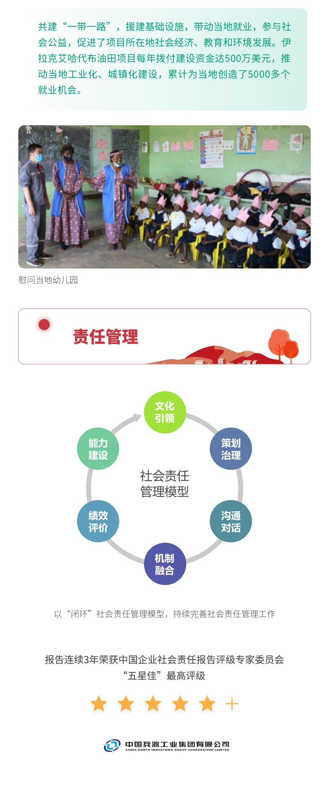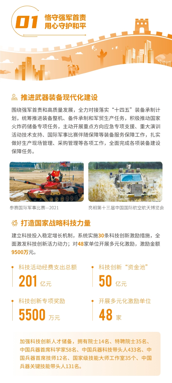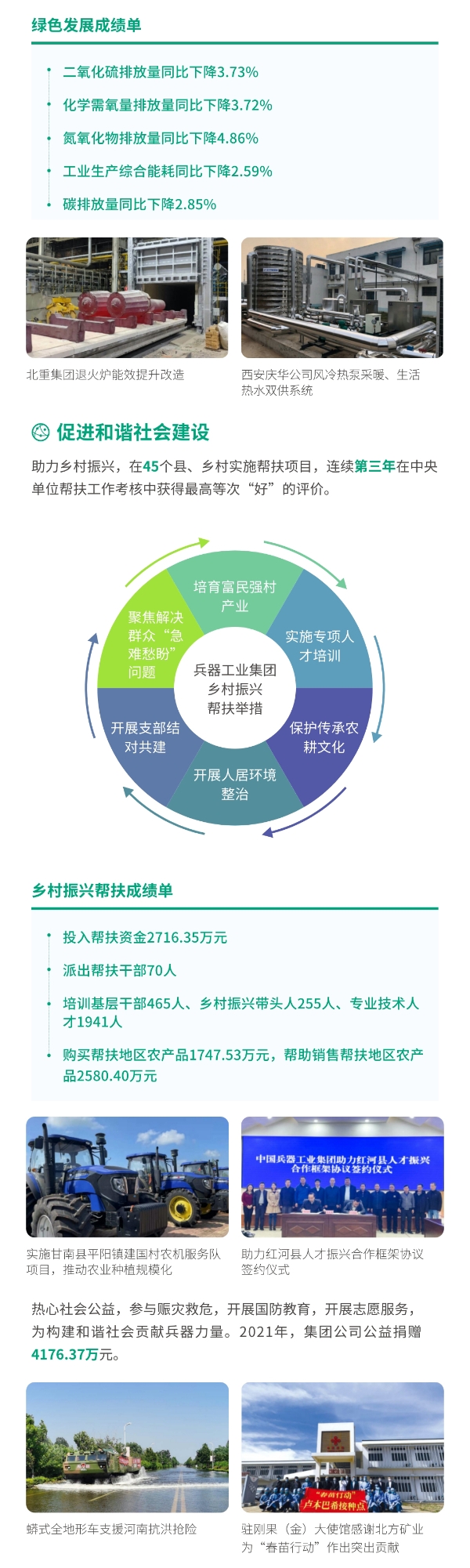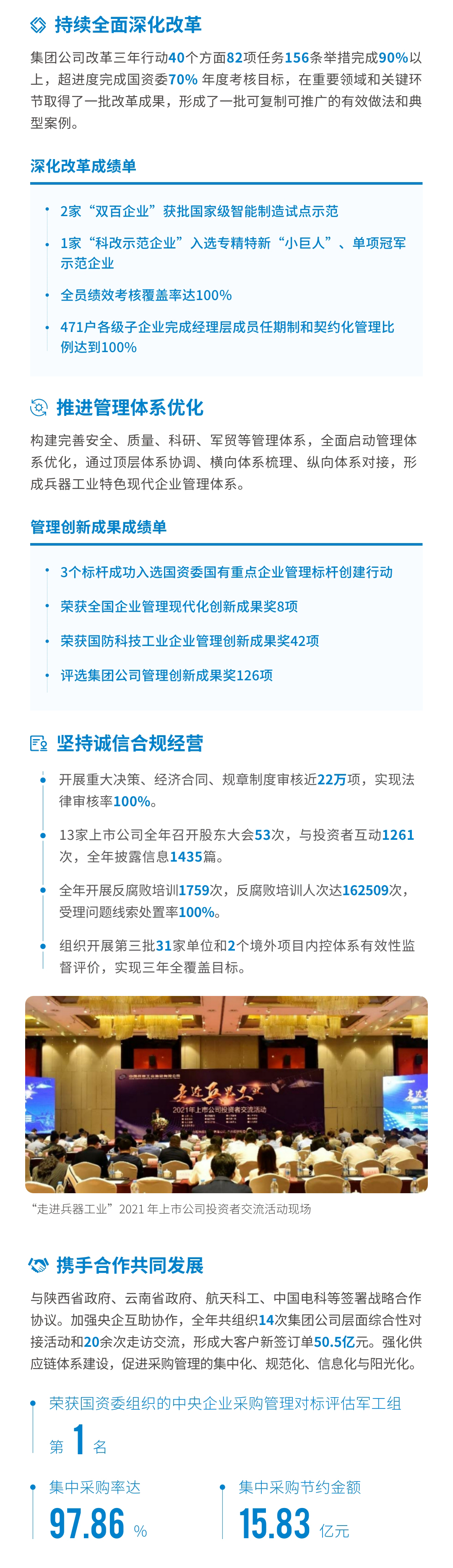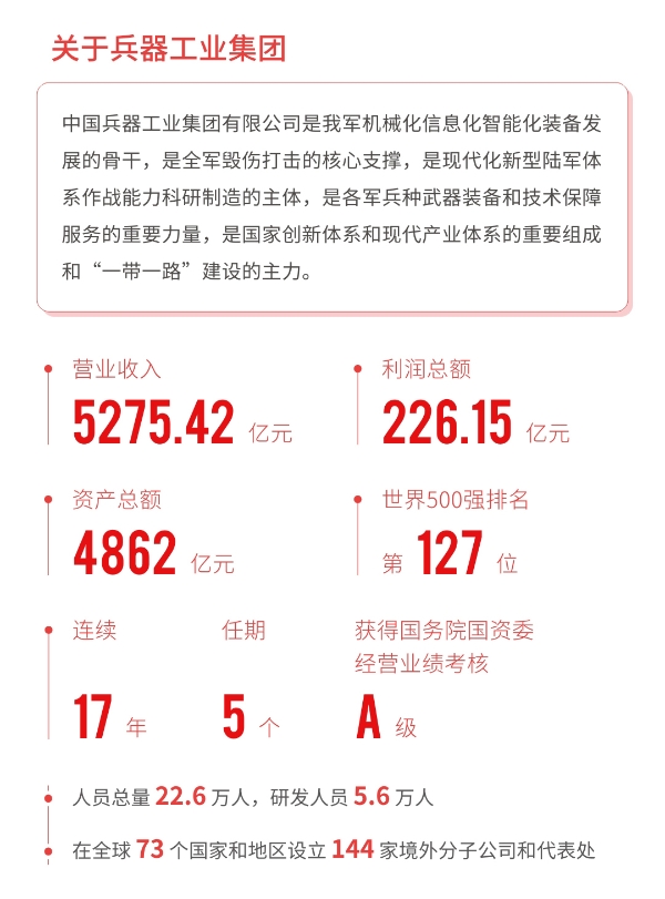 近日,兵器工业集团正式发布第十三份年度社会责任报告——《环球(中国)体育官方网站2021年社会责任报告》,以“用心守护和平、用力争创一流、用情温暖社会”为主题,从恪守强军首责、服务经济建设、共创美好生活三个维度,向社会全面披露2021年度履责实践和履责业绩。《报告》连续第三年获得中国企业社会责任报告评级专家委员会“五星佳”评级,兵器工业集团成为军工行业唯一连续11年获得五星及五星佳最高评级的企业。