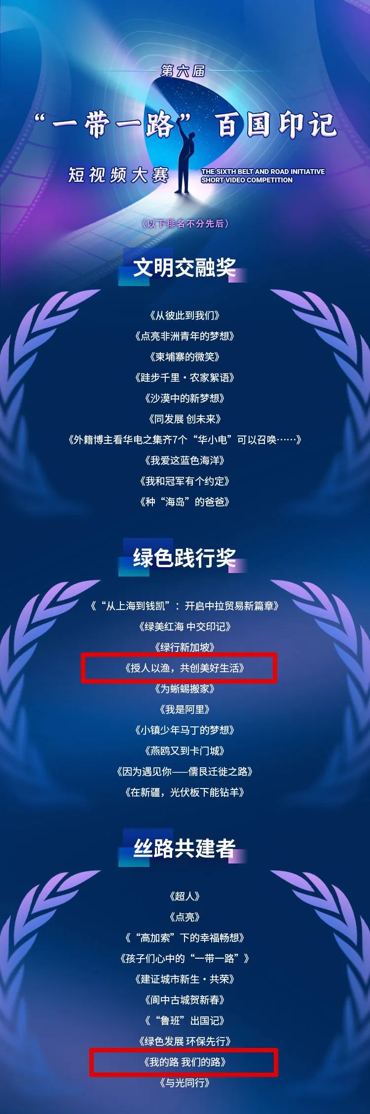近日,由中国公共外交协会主办,国务院国资委新闻中心等单位协办的第六届“一带一路”百国印记短视频大赛获奖名单正式揭晓,经过激烈角逐,共有108部作品脱颖而出,中国兵器工业集团北方公司两部作品获奖,其中,北方矿业《授人以渔,共创美好生活》荣获“绿色践行奖”,北方国际《我的路 我们的路》荣获“丝路共建者”。