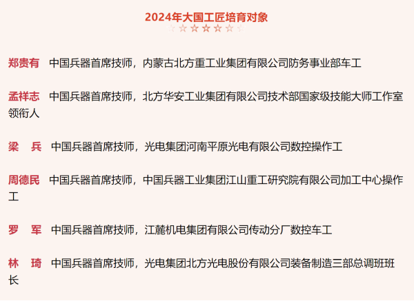 兵器工业集团6名高技能人才入选2024年大国工匠培育对象名单 |