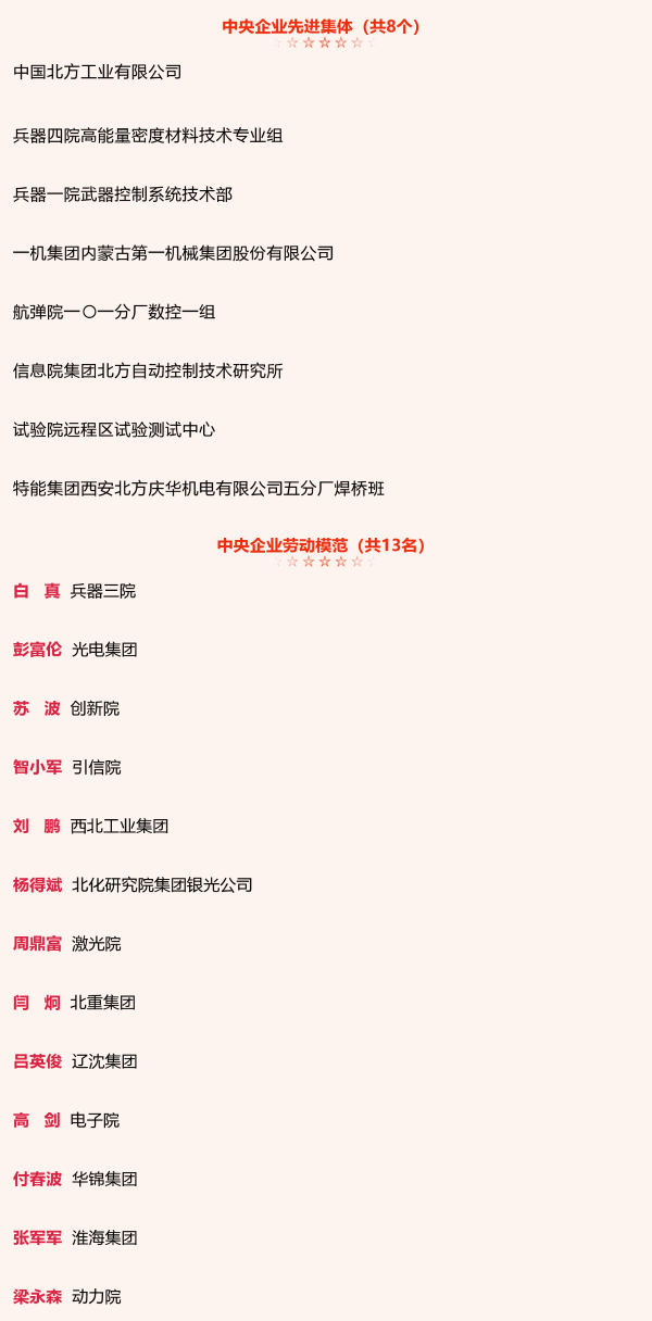 兵器工业集团8个集体和13名个人获中央企业先进集体和劳动模范表彰 |