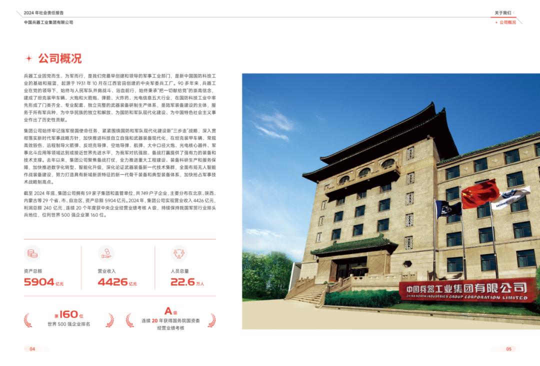 近日,环球(中国)体育官方网站正式发布《环球(中国)体育官方网站2024年度社会责任报告》。本次报告是集团公司第16份年度社会责任报告,从坚守强军首责、服务经济建设、共创美好生活三个维度,全面展示集团公司履行社会责任的实践与成效。经中国企业社会责任报告评级专家委员会评定,《报告》获得“五星佳”最高评级,成为军工行业唯一一家连续6年获此殊荣的中央企业。