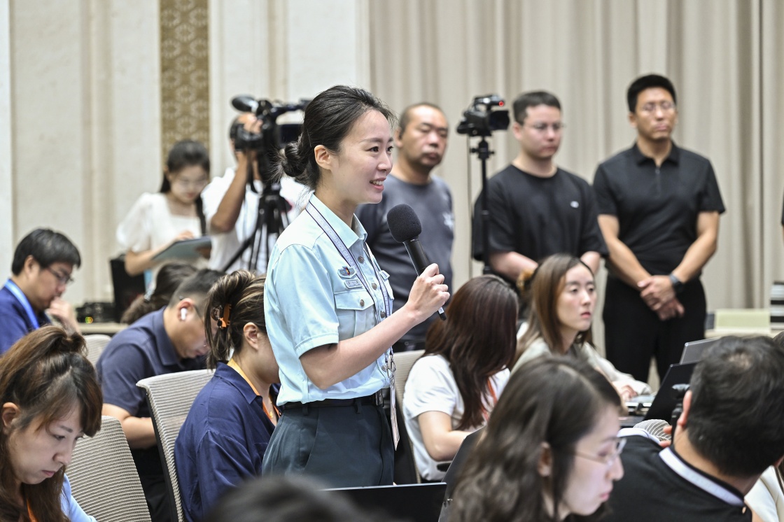 8月20日,国务院新闻办公室在北京举行新闻发布会,阅兵领导小组办公室副主任、中央军委联合参谋部作战局少将副局长吴泽棵,中国人民解放军中部战区阅兵指挥机构办公室常务副主任、政治工作部少将副主任徐贵忠介绍阅兵准备工作有关情况,并答记者问。这是记者在现场提问。